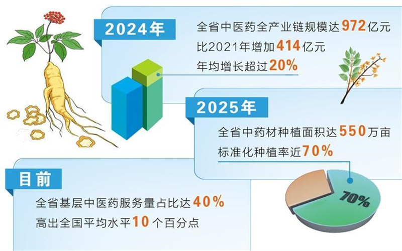 如今,全省已建立起覆盖省、市、县、乡的中医药服务体系,实现所有综合医院中医药服务全覆盖,基层医疗卫生机构中医馆全覆盖,中医适宜技术推广使用全覆盖,基层中医药服务量占比达40%,高出全国平均水平10个百分点,真正做到让人民群众“方便看中医、放心吃中药”。