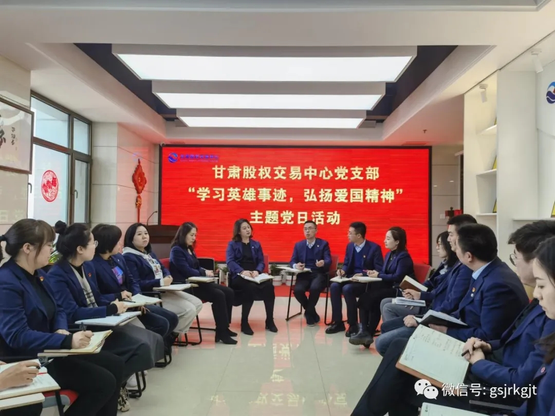 近日,甘肃股权交易中心党支部开展“学习英雄事迹,弘扬爱国精神”主题党日活动。学习戍边卫国英雄先进事迹,弘扬伟大爱国主义和革命英雄主义精神。